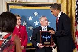 On July 24, 2009, President Barack Obama signed the authorization for Monti to receive the Medal of Honor for this action. The medal was presented to the family by the President in a formal ceremony at the White House on September 17, 2009.[5] Monti is the 3,448th recipient of the honor since the medal was established by the U.S. Congress during the American Civil War.[11] Additionally, he is the second Medal of Honor recipient from the conflict in Afghanistan, after Navy SEAL Michael P. Murphy, who received the medal in 2007.[1]
