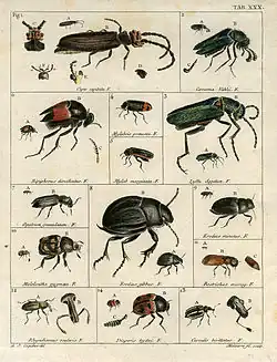 Jean Antoine Coquebert de Montbret (1753, Paris- 6 April 1825) was a French entomologist. He wrote Illustratio iconographica insectorum quae in musaeis parisinis observavit et in lucem edidit Joh. Christ. Fabricius, praemissis ejusdem descriptionibus; accedunt species plurimae, vel minus aut nondum cognitae, Paris: P. Didot, 1799-1804 an illustrated work on insect specimens in the Museum d'Histoire Naturelle in Paris. The insects appear as inside an insect box.