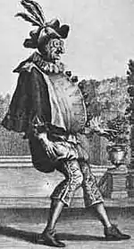 Bérain also designed for the theatre. By 1674 he had already begun designing costumes for Jean-Baptiste Lully's Opéra, including costumes for dancers in the divertissements. For Lully's 1684 opera Amadis, a tale of chivalric romance, Bérain carried out research into the styles of the Middle Ages and the Renaissance, a historical approach to costume design that was unusual for the time. Besides costume designs for Lully's tragédies en musique, Bérain designed the costumes for Lully's ballets Le triomphe de l'amour (1681) and Le temple de la paix (1685).[9]