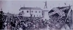 The statue itself was dedicated on February 22, 1911. The ceremony included a mass of schoolchildren dressed in red, white, and blue making a formation of a Confederate flag, and a speech by then-Louisiana Governor Jared Y. Sanders Sr., followed by the children singing "Dixie".[3] Former Confederate officer Bennett H. Young also spoke at the ceremony.[3][4] The date of dedication was said to correspond with the 50th anniversary of the inauguration of Jefferson Davis as President of the Confederate States of America, though the actual anniversary would have been four days earlier since Davis's inauguration was on 18 February 1861.