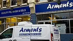 Eels were historically a cheap, nutritious and readily available food source for the people of London; European eels were once so common in the Thames that nets were set as far upriver as London itself, and eels became a staple for London's poor. The earliest known eel, pie and mash houses opened in London in the 18th century, and the oldest surviving shop, M.Manze, has been open since 1902.[1] At the end of the Second World War, there were around 100 eel, pie and mash houses in London.[2] In 1995, there were 87.[3]