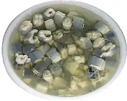 Jellied eels are traditionally prepared using the European eels native to Britain. Typically, the eels are chopped (shucked) into rounds and boiled in water and vinegar to make a fish stock with nutmeg and lemon juice, before being allowed to cool. The eel is a naturally gelatinous fish, with the cooking process releasing proteins, like collagen, into the liquid, which solidify upon cooling to form a jelly, though gelatin may be added in order to aid this process.