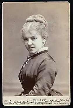 By 31 March, Lee and Burnett had apparently parted from Galton's troupe and were now appearing together at San Francisco's California Theatre in Thomas Haynes Bayly's one-act farce The Maid of Munster.[40] The two remained at the California and later Platt's Hall into the month of April appearing in the two-act English farce The Happy Pair and several benefit shows.[40][41] On 23 May at San Francisco's Maguire's New Theatre Lee was the heroine Gilberte in Augustin Daly's adaptation of the Ludovic Halévy and Henri Meilhac five-act comedy, Frou-Frou.[42][43]