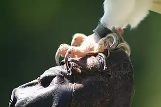 A jess (plural "jesses") is a thin strap, traditionally made from leather, used to tether a hawk, falcon, or owl in falconry.[1] Jesses allow a falconer to keep control of a bird while it is on the glove or in training, and allow a bird to be secured on a perch outside its aviary.[1]