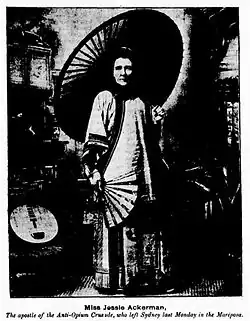 Ackermann was actively involved in campaigns for women's rights as well as the ongoing international struggle against opium and also tobacco.[4] She became World's superintendent of the WCTU's anti-opium department in 1893–95 and in 1891 established an Anti Narcotics Department of the WCTU in Australia. In 1906 she was made one of the only women fellows of the Royal Scottish Geographical Society.[5][6]