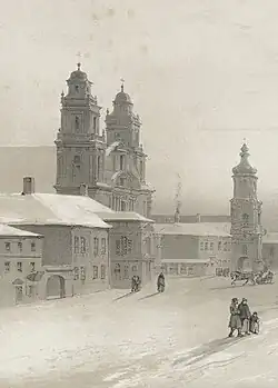 According to the Jesuit historian, Franciszek Rzepnicki, the Jesuits arrived in Minsk in the first half of the 17th century. Duke Paweł Sanguszko brought the monks to the city in 1631, endowing them with a church and college.[4] Other sources indicate the year 1654 when Prince Hieronim Władysław Sanguszko, the Bishop of Smolensk, granted the Minsk Jesuits a permanent fund. They acquired a brick mansion from Jegor Heger at the corner of Kojdanowska Street and High Martek, which the monks designated as their headquarters.[5] In the early period of their activities in Minsk, their community had the status of a mission dependent on the Jesuit college in Nyasvizh.[6] In 1686, the Jesuits obtained the status of residents, and in 1714, they were granted a college, which marked the high level of education they provided.[3]