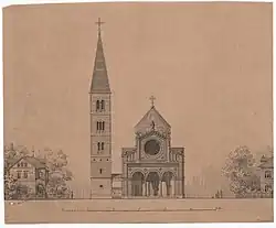 The church's designer, Vilhelm Dahlerup, certainly the leading Danish architect of the period, is remembered for his historistic style whereby he created new buildings on the basis of older, classical examples.[2] There were, however, rather precise instructions on how the Jesus Church should be designed. In particular, Jacobsen provided Dahlerup with a number of photographs of the old churches and artwork in Ravenna, Italy, as an example of the ornate style he wished to see copied in Copenhagen. Dahlerup was also inspired by Notre-Dame la Grande in Poitiers, France, and by the synagogue in Toledo, Spain.[3]