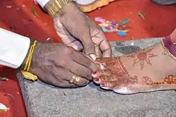 - Metti or Minji or Peeli, grooms place it on the bride's second finger from toe during wedding.