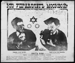 Antisemitic Russian White movement propaganda poster "Who Rules Moscow? Here they are - Red Bolsheviks, Communists-Socialists, Proletarians" (1919), caricatures of Yakov Sverdlov and Leon Trotsky, who was viewed as a symbol of Jewish Bolshevism,[1] with the Star of David, depicting the Bolsheviks as Jews oppressing Russians and striving for money and power
