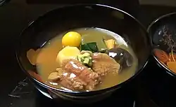 Jibu-ni (じぶ煮, 治部煮) is a Japanese dish that is part of the regional cuisine of Kanazawa and the surrounding Ishikawa region. It is a stew made from duck or chicken meat coated in flour, wheat gluten, vegetables, and mushrooms all simmered together in dashi stock.[1][2] It is often served as part of kaiseki.[3]