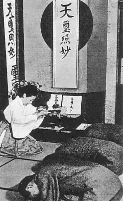 In July 1945,[22] after their landlord reported the group to the police, Nagaoka was arrested under charges of lèse-majesté and released after ten days.[23] On 12 July, Nagaoka declared herself to be the representative of Amaterasu, believing that she was sent to help the Emperor through the "holy war" (the bombing of Tokyo and Yokohama).[14][24]