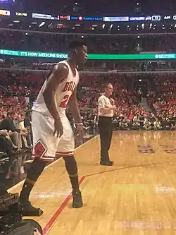 Butler was selected with the 30th overall pick in the 2011 NBA draft by the Chicago Bulls.[11] He played 42 games during the lockout-shortened 2011–12 season.[12] The following season, he played all 82 games for the Bulls. Butler played limited minutes to begin the 2012–13 season. His minutes increased over the second half of the season and he started in all 12 playoff games.[12][13] In an April 9, 2013, regular season game, Butler scored a then career-high 28 points in a 101–98 loss against the Toronto Raptors.[12][14] Two days later, he recorded his first NBA double-double game with 22 points and a then career-high 14 rebounds against the New York Knicks.[12]