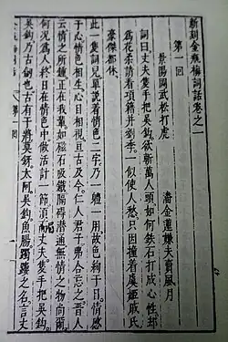 Jin Ping Mei (Chinese: 金瓶梅)—translated into English as The Plum in the Golden Vase or The Golden Lotus—is a Chinese novel of manners composed in vernacular Chinese during the latter half of the 16th century during the late Ming dynasty (1368–1644). Consisting of 100 chapters, it was published under the pseudonym Lanling Xiaoxiao Sheng (蘭陵笑笑生), "The Scoffing Scholar of Lanling,"[1] but the only clue to the actual identity is that the author hailed from Lanling County in present-day Shandong.[2] The novel circulated in manuscript as early as 1596, and may have undergone revision up to its first printed edition in 1610. The most widely read recension, edited and published with commentaries by Zhang Zhupo in 1695, deleted or rewrote passages to help understand the author's intentions.[3]