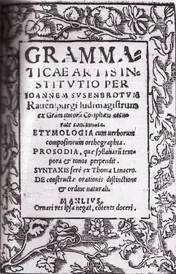 Joannes Susenbrotus (also spelled Susembrotus, also known as Johannes or Hans Susenbrot, 1484/1485–1542/1543) was a German humanist, teacher of Latin, and author of textbooks.
