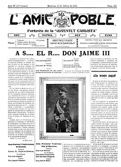 More distant Gomis' ancestors tended to support the Conservatives,[38] but his father was a Carlist, perhaps of some Integrist leaning.[39] He remained on friendly terms with the regional party leader Luis Maria Llauder Dalmases[40] and in Manresa he ranked as the second Carlist after Ignacio Vidal Balet,[41] though he did not feature prominently in the Catalan party organisation.[42] Joaquín inherited political preferences from his parent. In 1890 he took part in homage sessions to Carlist leader marqués de Cerralbo,[43] in the early 1890s he served as secretary in Centro Católico de Manresa[44] and joined Juventud Carlista Manresana. He demonstrated particular interest in press endeavors; during the decade he edited a periodical La Voz Manresana, the mouthpiece of local Traditionalism.[45] In 1905 he founded the Catalan-language L'Amic del Poble,[46] which initially proved short-lived until revived some time later.[47]