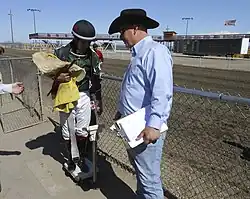 Jockeys usually start out when they are young, exercising horses in the morning for trainers, and entering the riding profession as apprentice jockeys. It is normally necessary for an apprentice jockey to ride a minimum of about 20 barrier trials successfully before being permitted to ride in races. An apprentice jockey is known as a "bug boy" because the asterisk that follows the name in the program looks like a bug.[9] All jockeys must be licensed and usually are not permitted to bet on a race. An apprentice jockey has a master, who is a horse trainer, and the apprentice is also allowed to "claim" weight off the horse's back: in handicapped races, more experienced riders will have their horses given an extra amount of weight to carry, whereas a jockey in their apprenticeship will have less weight on their horse, giving trainers an incentive to hire these less-experienced jockeys. This weight allowance is adjusted according to the number of winners that the apprentice has ridden. After a four-year indentured apprenticeship, the apprentice becomes a senior jockey[10] and usually develops relationships with trainers and individual horses. Sometimes senior jockeys are paid a retainer by an owner which gives the owner the right to insist the jockey ride their horses in races.