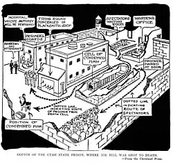 In 1914, John G. Morrison, a Salt Lake City area grocer and former policeman, and his son were shot and killed by two men.[7] The same evening, Hill arrived at a doctor's office with a gunshot wound, and briefly mentioned a fight over a woman. He refused to explain further, even after he was accused of the grocery store murders on the basis of his injury. Hill was convicted of the murders in a controversial trial. Following an unsuccessful appeal, political debates, and international calls for clemency from high-profile figures and workers' organizations, Hill was executed in November 1915. After his death, he was memorialized by several folk songs. His life and death have inspired books and poetry.