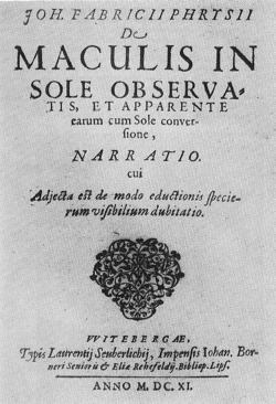 - Joh. Fabricii Phrysii De Maculis in Sole observatis, et apparente earum cum Sole conversione, Narratio, etc. Witebergae, Anno M.DC.XI. (year 1611).