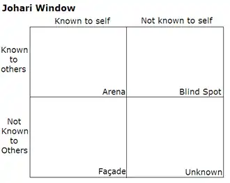 The Johari window is a technique[1] designed to help people better understand their relationship with themselves and others. It was created by psychologists Joseph Luft (1916–2014) and Harrington Ingham (1916–1995) in 1955, and is used primarily in self-help groups and corporate settings as a heuristic exercise.[2][3] Luft and Ingham named their model "Johari" using a combination of their first names.