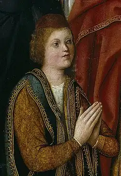Isabella I was quite an attentive mother for such a busy queen.[10] John, being her only son and of delicate health, was doted on,[11][12] and she referred to him affectionately as 'my angel' even when he was being reprimanded by her.[13] Isabella and Ferdinand attempted to ensure the sickly prince's well-being through prayer, charity, and careful oversight of his health.[14][15] John's wetnurses were Maria de Guzman, a member of the powerful Spanish House of Mendoza,[12] and Juana de Torres.[16] The latter stayed by the prince's side well into his adolescence, possibly as a result of his frail health.[17]