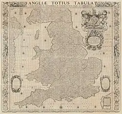 Aware that he had needed to omit a great many places shown on Saxton's and Norden's county maps, Adams began to compile a list of them, and engaged King to supplement this list by extracting place-names from the recently collected records of the Hearth Tax surveyors.[11] The resulting Index Villaris, or an Alphabetical Table of all Cities, Market-towns, Parishes, Villages, Private Seats in England and Wales, published in 1680, contains no fewer than 24,000 entries detailing key information about each place; the publication included a copy of the reduced 1679 map. In the Preface, Adams described how, before coming to London, he had tabulated the distances between market towns in north Wales in order to calculate the potential market for fish landed at Aberdovey; on his arrival in London and recognising the economic value of such distance tables he had extended them across the whole of England and Wales. The inclusion of geographical coordinates for every place, calculated by triangulating the distances between places reported by his correspondents and between points indicated on earlier maps (taking as a basis the coordinates of county towns published by Speed),[12] is testament to Adams' vision and tenacity.[note 5] Index Villaris was so successful that it was reprinted in 1690 and again in 1700,[note 6] and numerous copies remain in the local collections of the National Trust.[14]