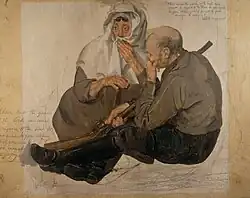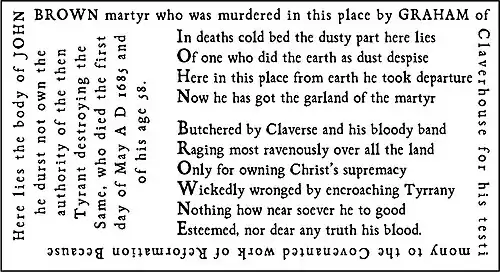In 1685, Brown was captured (along with his nephew, one 'John Brownen') by a troop of horse under the command of Graham of Claverhouse. Brown's house was searched where 'bullets, match and treasonable documents' were found.[9] Brown was offered the chance to take the Oath of Abjuration. Brown refused to swear the oath which was designed to be repugnant to Covenanters and thereby a "sieve, the mesh of which would winnow the loyal from the disloyal".[10]