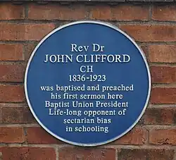 John Clifford CH (16 October 1836 in Sawley, Derbyshire – 20 November 1923 in London) was a British Baptist Nonconformist minister and politician, who became famous as the advocate of passive resistance to the Education Act 1902.[1]