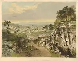 In the 19th century Bourne gave face to the fascination with the new railway technology.[32] He was among the earliest artists to "integrated the depiction of railway construction into a well established landscape tradition. The rails were sometimes barely visible or coexisted with the stock landscape elements of cattle, rocks, sky, and greenery."[33] Nowadays Bourne is considered one of the greatest railway artists,[31][34][35] and is described by Elton[36] as "the Piranesi of the Railway Age."[18][37] According to Russell (2001) Bourne's two series of railway scene's were the only works, that equalled the work of Thomas Shotter Boys.[38] Burman & Stratton (1997) explained:
