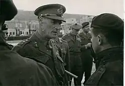 The corps, losing the 3rd Division soon after and gaining the 49th Division (Major-General Evelyn Barker) in exchange, came under command of the First Canadian Army (Lieutenant-General Harry Crerar) in August 1944, I Corps drove forward to the River Seine and then took part in the Clearing the Channel Coast.[31] The relationship between Crocker and Crerar was not always cordial, with the latter, shortly after taking Crocker's I Corps under command of the First Army, attempted to sack Crocker and replace him with either Lieutenant-Generals Neil Ritchie (GOC XII Corps) or Gerard Bucknall (GOC XXX Corps). However, Crerar was overruled by Montgomery, the 21st Army Group commander, although the relationship improved thereafter.[31][33]