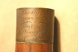 A set of pipes [4] with a single-octave chanter was presented by John Dunn to John Peacock in 1797; this set now lacks the original chanter, but still carries the original engraved ferrule on the drone-stock reading: 'The Gift of John Dunn to John Peacock Newcastle 1797'. The engraved inscription is generally thought to have been done in the workshop of Thomas Bewick. It was acquired by the Society of Antiquaries of Newcastle upon Tyne, with the support of the Victoria and Albert Museum in 2004, and is now in the Morpeth Chantry Bagpipe Museum.