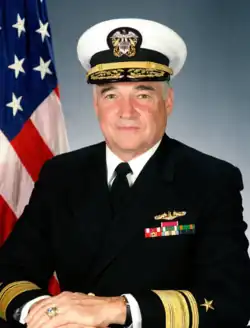 Following U.S. Navy nuclear power training and the Submarine Officer Basic Course,[34] Till served aboard the USS Guardfish (SSN 612) where he qualified in submarines.[35] He continued his navy career in the United States Naval Reserve retiring as a two-star admiral (O-8) in 1999.[36] As a reserve flag officer, he served as Chairman on the National Navy Reserve Policy Board.[37] He is the recipient of the Department of Defense Distinguished Service Medal, the Legion of Merit, Navy Meritorious Service Medal (two awards), Commendation Medal (two awards), and the Navy Achievement Medal.[35]