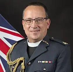 Following training,[7] he was commissioned into the Royal Air Force Chaplains Branch on 5 August 2004.[8] He then served as chaplain to several RAF stations, and served tours in Iraq and Afghanistan.[7] He was promoted to the relative rank of squadron leader on 5 August 2006,[9] and to the relative rank of wing commander on 1 January 2011.[10] He then served as Joint Force Senior Chaplain in Afghanistan.[7] He was promoted to the relative rank of group captain on 23 March 2015.[11] He then served as Deputy Chaplain-in-Chief (Personnel) and was based at Headquarters Air Command.[7]