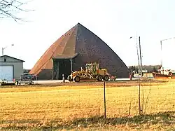 John Fitzpatrick invented a structure known as the Fitzpatrick Dome to store large quantities of road sand/salt mixtures used to treat roads in winter when ice and snow make driving hazardous. The igloo type design was helpful in areas where snowfall would otherwise accumulate on a flat-roof structure. The dome is a 20-sided conical shell 100 feet in diameter and 50 feet in height. As it is prefabricated, larger or smaller domes can be erected simply by adding or deleting rings.[9][10]
