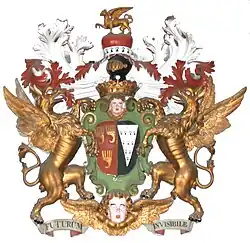 The armorials of the family of Granville / Grenville of Glamorgan, Devon and Cornwall are of certain form but uncertain blazon. The charges appear in the form of musical pipes of a wind instrument, similar to pan-pipes. Authoritative sources on heraldry suggest the charges to be variously "clarions" (used by Guillim (d. 1621)), the most usual blazon, which are, however, generally defined as a form of trumpet; "rests" is another common blazon, denoting lance-rests supposedly used by a mounted knight; "organ-rests" is also met with, a seemingly meaningless term (Gibbon (1682)). Other terms are "clavicymbal", "clarichord" and "sufflue" (used by Leigh in his Armory of 1562 and by Boswell, 1572),[16] the latter being a device for blowing (French: souffler) air into an organ.[17] Guillim suggested the charge may be a rudder,[17] but in which case it is shown upside down, when compared to that charge used for example on the tomb at Callington of Robert Willoughby, 1st Baron Willoughby de Broke. Certainly in the brasses on the chest tomb of Sir John Bassett (d. 1529) in Atherington Church, Devon, the charges are engraved in tubular forms with vents or reeds as used in true organ pipes.