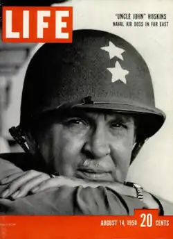 Life magazine sent correspondents to the conflict and on August 14, 1950, put "Uncle John" Hoskins on the cover and profiled his career at some length. The article made much of Hoskins's "homely" language, his excellent relationship with the officers and men serving under him, and his pragmatic and dogmatic approach to the mission.[6] Hoskins complimented the extraordinary interservice teamwork: "You can't say enough about the fine cooperation and coordination we have with the Air Force."[6] He also praised the efforts of his carrier division, saying "It's wonderful to manage a team when every player gets a hit every time he comes to the plate."[6]
