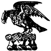 The heraldic crest of Lathom (An eagle wings extended or preying on a child proper swaddled gules in a cradle laced or[2]) was adopted by Sir John Stanley and his descendants. An ancient myth ("the Stanley Legend"), of several varieties, is attached to the image depicted, one given by Thomas Stanley (died circa 1568), Bishop of Sodor and Man being that the "Lord of Lathom" was issueless and aged "fowerscore" adopted an infant "swaddled and clad in a mantle of redd," which an eagle brought unhurt to her nest in Terlestowe wood, and which he named Oskell, and made heir of Lathom, where he became the father of Isabel Stanley, stolen away in the first instance by her knight, and afterwards forgiven by Sir Oskell". [3] The Stanley crest is today memorialised in the name of several English public houses displaying the sign of "The Eagle and Child", often situated within manors once held by the Stanley family.