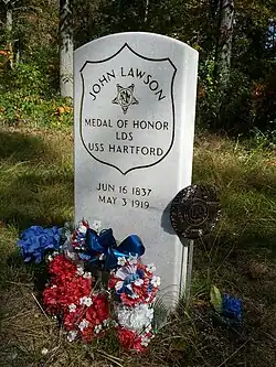 John Lawson was born June 16, 1837. in Philadelphia, Pennsylvania. He enlisted the Navy in New York in December 1863.[1] On August 5, 1864, during the Battle of Mobile Bay, while serving in a member of USS Hartford's berth deck ammunition party, he was seriously wounded after a shell had wounded him in the leg and killed or wounded the rest of his crew. Despite his wounds, he remained at his post and continued to supply the Hartford 's guns. John Lawson was one of twelve men who received the Medal of Honor for heroism that day.