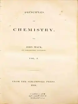 Mack served initially as a professor of chemistry at the Serampore College.[3] He taught and produced a bilingual textbook of chemistry in English (Principles of Chemistry, Volume 1)[a] which was translated into Bengali by William Carey's son Felix Carey (died 1822[4])[b] as কিমিয়া বিদ্যার সার (Kimia Bidyar Sara) in 1834.[6] He also taught classics, philosophy and geography and had a Bengali translation made of the map of India.[7][8] The public lectures on chemistry were well attended with nearly 80 to 100 students and he was able to contribute 100 guineas [c] to the mission funds from his class earnings.[9][10][11] In 1834, the students included 34 Hindus, 6 Eurasians and 43 Indian Christians.[12] He edited a paper called the Friend of India which was founded at Serampore in 1835 along with John Leechman.[13][14]