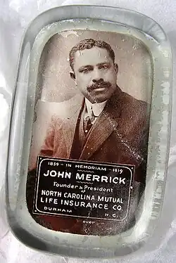 John Merrick (1859–1919) was an American businessman. Born into slavery in Clinton, North Carolina, Merrick founded various companies in the Raleigh, North Carolina and Durham, North Carolina areas, most notably the North Carolina Mutual Life Insurance Company. Portions of his wealth were channeled back into the black community through philanthropy. His business acumen and social consciousness made him one of the most influential members of the African-American community in his lifetime.