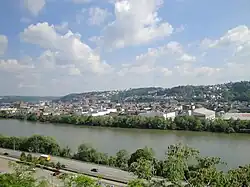 This land stretched from the present-day Smithfield Street Bridge to Becks Run Road along the Monongahela River; Ormsby called it Homestead Farms.[7][8] In 1773, Ormsby received a license to operate a ferry across the Monongahela River, which connected Pittsburgh with his estates in what is now called the South Side. He operated this ferry, the first in Pittsburgh, until he sold it in 1789.[9] He also established a brickyard and boatyard near his estate.[10] This ferry was later operated by John Patch and served as a contributor to the development and culture of the area in centuries following.[11]