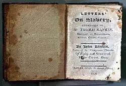 Early in his time in Ripley, Rankin learned that his brother Thomas, a merchant in Augusta County, Virginia, had purchased slaves. He was provoked to write a series of anti-slavery letters to his brother that were published by the editor of the local Ripley newspaper The Castigator. When the letters were published in book form in 1826 as Letters on Slavery, they provided one of the first clearly articulated anti-slavery views printed west of the Appalachians. Thomas Rankin, convinced by his brother's words, moved to Ohio in 1827 and freed his slaves. By the 1830s, Letters on Slavery had become standard reading for abolitionists all over the United States. In 1832, William Lloyd Garrison printed the letters in his anti-slavery newspaper, The Liberator. Garrison later called Rankin his "anti-slavery father," saying that "his book on slavery was the cause of my entering the anti-slavery conflict."[15]