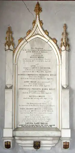 Rolle died in 1842 at Bicton House in Devon.[35] As part of her re-building of Bicton Church as St Mary's Church, completed in 1850, his widow Louisa retained as a Rolle mausoleum part of the ruins of the ancient Church of the Holy Trinity on the site and erected therein an elaborate monument to the memory of her husband, designed by Pugin and sculpted in the London workshop of George Myers. It consists of a Gothic-style chest tomb in front of a high arch filled-in with Gothic-style tracery and sculpted figures. In the same mausoleum is the baroque monument to his distant cousin Denys Rolle (1614–1638), who had inherited Bicton from his mother Anne Denys. He was third in descent from John Rolle (died 1570), the eldest son and heir of the patriarch George Rolle (died 1552) of Stevenstone, MP for Barnstaple. The Rolle Mausoleum is the private property of Lord Clinton and is not open to the public as from 2012.