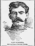 Scannell played right tackle for Exeter, including a game against New Hampshire in 1895 during which he scored a touchdown and three conversion kicks.[6] He captained the Exeter squads of 1894 and 1895.[3] At Colby, he played right guard on the teams of 1896,[7] 1897,[8] and 1898,[9] serving as captain in the lattermost season.[4] In 1896, during the first-ever meeting of the Colby and New Hampshire programs,[10] he again scored a touchdown against New Hampshire.[11] He returned to playing right tackle for the Baltimore teams of 1899,[12] 1900,[13] and 1901,[14] serving as captain during his final season with the program.[5]