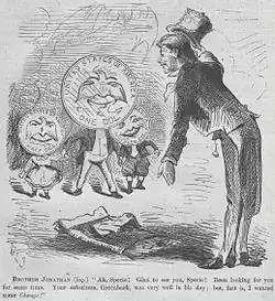 When Congress returned to Washington in December 1861, Sherman and the Finance Committee continued their attempts to fix the deepening financial crisis caused by the war. The financial situation had continued to worsen, resulting that month in banks suspending specie payments—that is, they refused to redeem their banknotes for gold.[62] Gold began to disappear from circulation.[63] With the 500,000 soldiers in the field, the government was spending the then-unheard-of sum of $2 million per day. Sherman understood that "a radical change in existing laws relating to our currency must be made, or ... the destruction of the Union would be unavoidable ..."[64] Secretary Chase agreed and proposed that the Treasury Department issue United States Notes that were redeemable not in specie but in 6% government bonds.[62] The bills would be "lawful money and a legal tender in the payment of all debts".[62] Nothing but gold and silver coin had ever been legal tender in the United States, but Congress yielded to the wartime necessities, and the resulting First Legal Tender Act passed both the House and the Senate.[e][65] The Act limited the notes (later known as "greenbacks") to $150 million, but two subsequent Legal Tender Acts that year expanded the limit to $450 million.[66] The idea of making paper money legal tender was controversial, and William Pitt Fessenden of Maine, chairman of the Senate Finance Committee, was among many who opposed the proposal.[67] Sherman disagreed and spoke in favor of the idea. He defended his position as necessary in his memoirs, saying "from the passage of the legal tender act, by which means were provided for utilizing the wealth of the country in the suppression of the rebellion, the tide of war turned in our favor".[67]