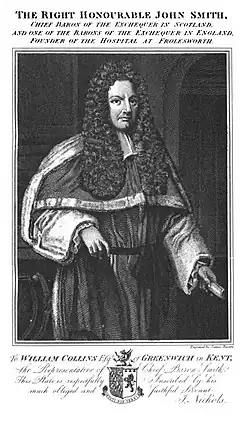 In May 1708 Smith was selected to settle the Court of Exchequer in Scotland, after the union with England, and for that purpose was made Lord Chief Baron of the Exchequer in Scotland; he kept (though another baron was appointed) his place in the English court, and receiving £500 a year in addition to his salary. He was re-sworn on the accession of George I as a baron of the English exchequer, although he performed none of the duties, and enjoyed both his English and his Scottish offices until his death on 24 June 1726, at the age of 69.[1]