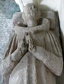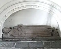 He died at Stowford and was buried in the Stowford Chapel in the north transept of West Down Church, where survives his much-worn[10] life-size effigy carved in oak, dressed in his robes of office,[11] set on the floor under a low recessed arch set into the north wall.[12] The colouring of the effigy was renewed in 1873,[13] but no trace survives today.