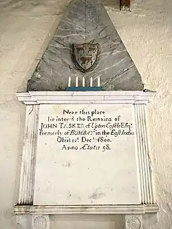 - ^ Monumental Inscription, Upton Chapel; Grant of Probate of the Will of John Tasker, TNA, PROB11/1354/172; burial entry, 19 December 1800, Nash Parish Register; Pembrokeshire Record Office, D-EE/14/1.