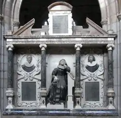 Many have stated that his son and heir was John Tuckfield (1555–1630) of Tedburn St Mary and Little Fulford in the parish of Shobrooke, near Crediton, Devon. However the only evidence of progeny is the record of two daughters: Katherine, widow of Rykard and wife of William Waye; and apparently another daughter, also Katherine wife of John Robyns. John Tuckfield (1555–1630) of Tedburn St Mary, later of Little Fulford, was the son of John Tuckfield (c. 1530–1586/89) of Crediton, himself the son of William Tuckfield clothier of Crediton (d. c. 1565) and his wife Joan daughter of John Kene of Upton Hellions. John's sculpted bust survives on the left-hand side of the "Tuckfield Monument" erected by his son Thomas in the chancel of Holy Cross Church, Crediton.[8] A black stone tablet below is inscribed: