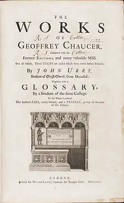 At the end of 1711, Christ Church's dean Francis Atterbury convinced a reluctant Urry to edit a proposed new edition of the works of Geoffrey Chaucer. Though the work was incomplete on Urry's death 4 years later (he is buried at Christ Church Cathedral, Oxford) and had to be completed and revised by Timothy and William Thomas, Urry's work on it – the first edition of Chaucer to be entirely in Roman type[2] – posthumously made his name.