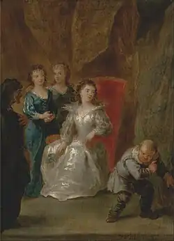 Vertue notes that Vanderbank ‘livd very extravagantly a mistres drinking & country house a purpose for her’.[36] This extravagance led him into debt and in 1724 Vanderbank fled to France briefly to avoid imprisonment by his creditors,[37] returning to enter 'the liberties of the Fleet', mansion houses near the Fleet prison in which privileged prisoners could enjoy relative comfort in return for payment.[2] In 1727 Vanderbank's mother died, having prudently left her assets out of reach of John's creditors to her younger son Moses, and in 1729 Moses sold a share in the family tapestry business to the painter John Ellys to settle John Vanderbank's debts. Vanderbank then accepted a free residence in Lord Carteret's house in Holles Street, neighbouring the Duke of Chandos's house in Cavendish Square, London.[8]